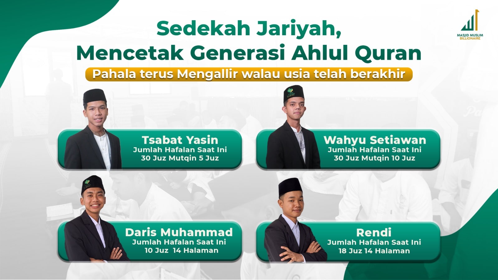 Program ini diinisiasi oleh Masjid Muslim Billionaire (Bogor) untuk mendampingi santri yatim penghafal Al-Qur’an yang menempuh pendidikan di Pondok CEO, lingkungan pesantren binaan Masjid Muslim Billionaire.